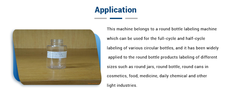 このマシンは、さまざまな円形ボトルのフルサイクルおよびハーフサイクルのラベリングに使用できるラウンドボトルラベリングマシンに属し、ラウンドジャー、ラウンドボトルなどの異なるサイズのラウンドボトル製品のラベリングに広く適用されています、化粧品、食品、医薬品、毎日の化学薬品およびその他の軽工業の丸缶。機器構成:電気キャビネット、搬送機構、別のボトル装置、ローリングラベル装置、ブラシラベル装置、1#ラベリングエンジン、操作システムおよび制御システム。